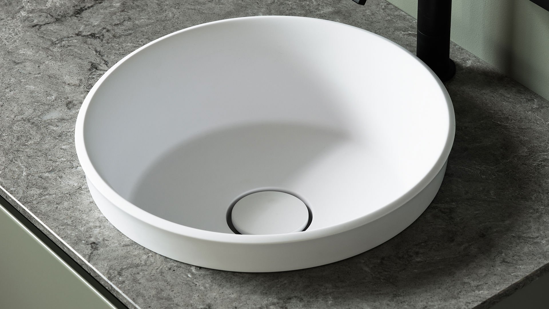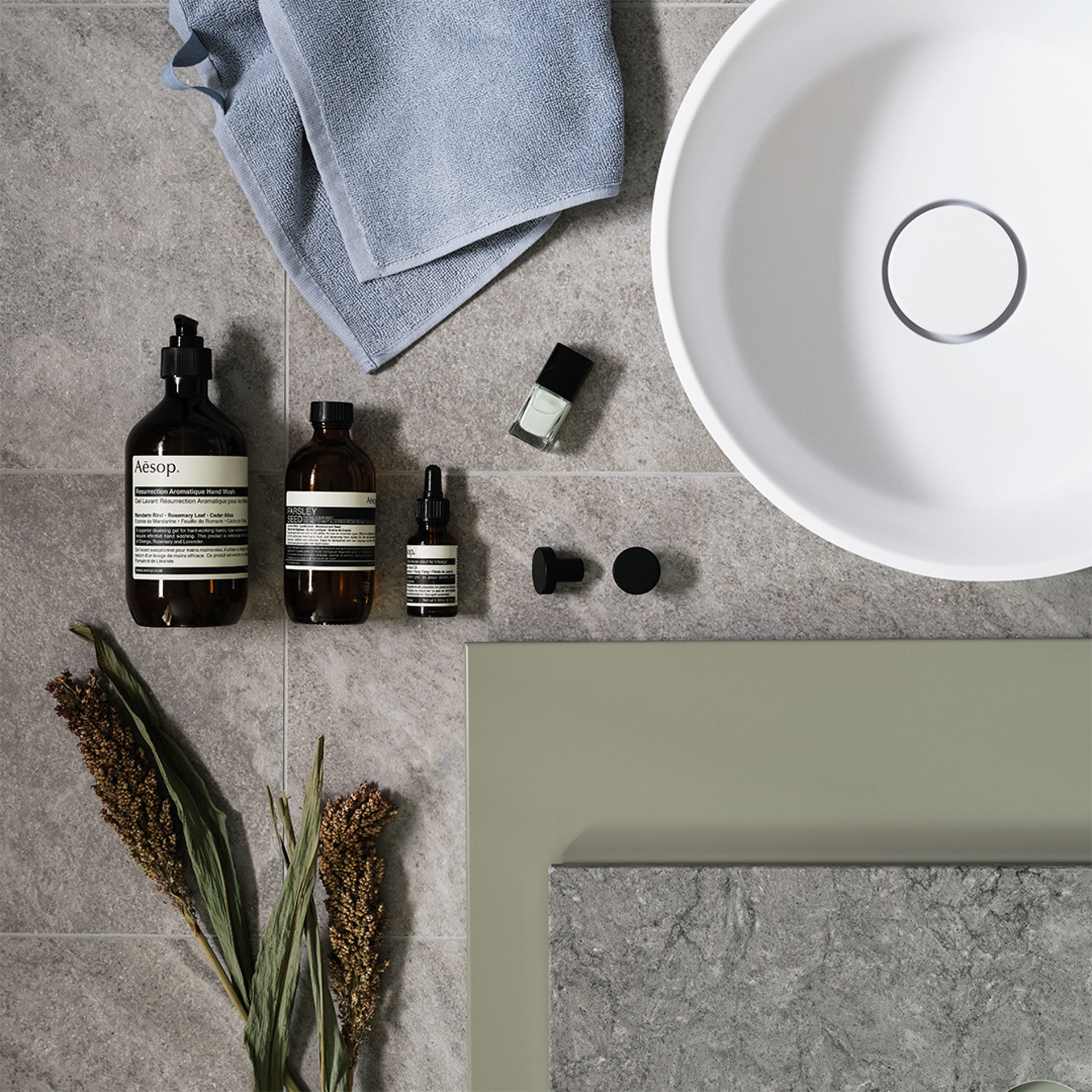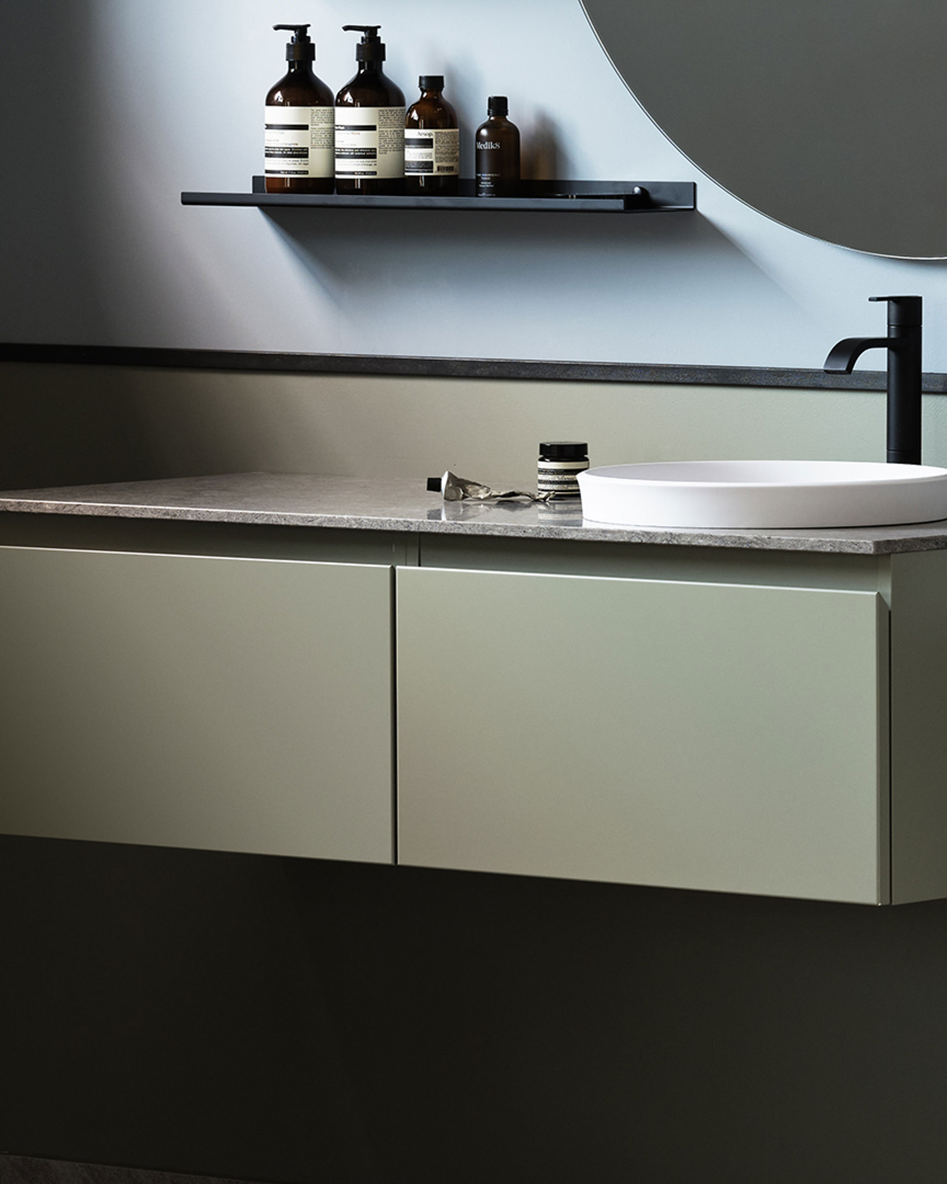 Et lyst og luftig bad med en fargekombinasjon der himmelblått møter grønt. Den taktile topplaten i komposittsteinen Turbine Grey passer fint til den halvt nedfelte servanten Zone. Her får du sjenerøse avlastningsflater ved håndvasken, et stort rundt speil for å skape ekstra plass og luftighet på badet – og hyller i sort metall som gir badet karakter.