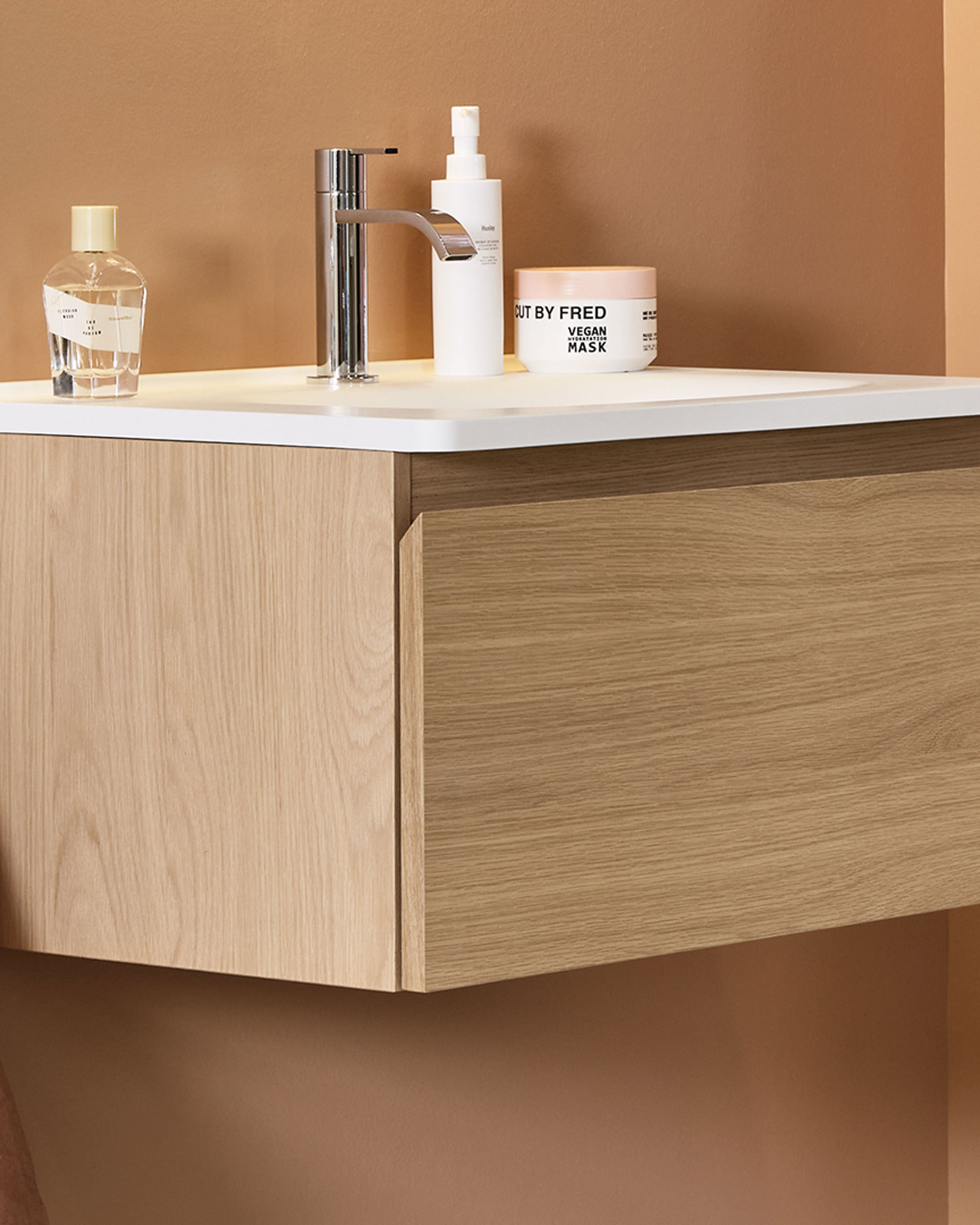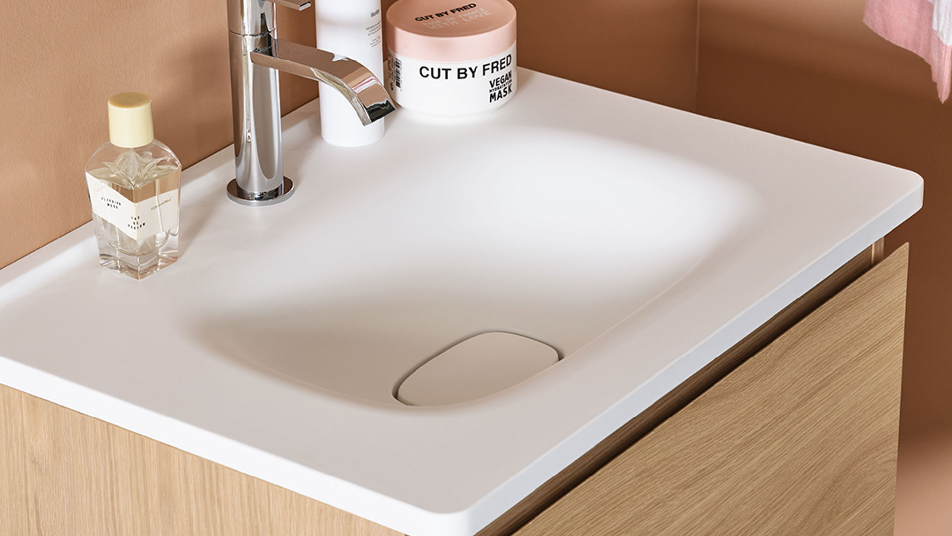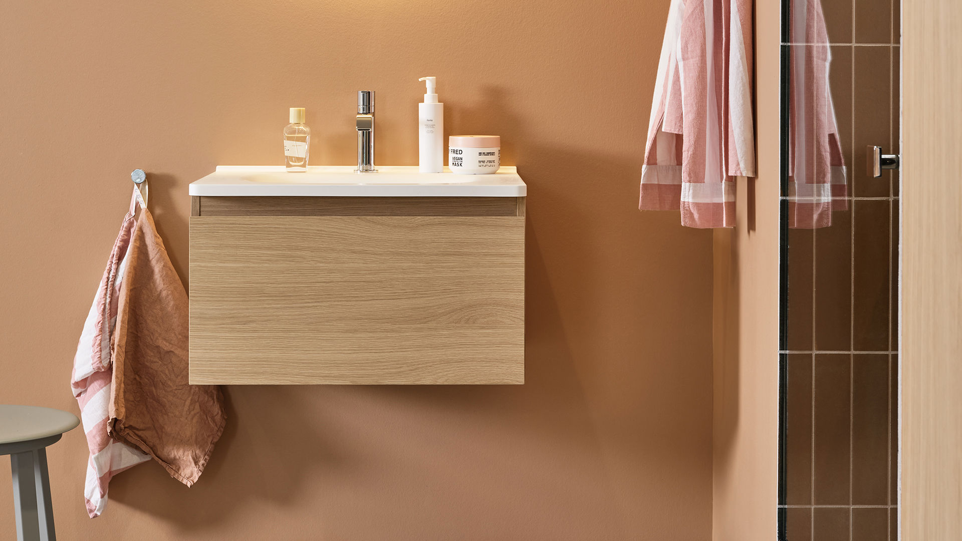 På dette badet har vi valgt en Flow i bredden 600 mm i en grunnere utførelse, uten å miste de rene linjene i serien. Den rosa tonen på veggene og de grønne flisene i dusjen står i skarp kontrast til steinuttrykket på gulvet og den hvitpigmenterte eikens ubehandlede trefølelse.