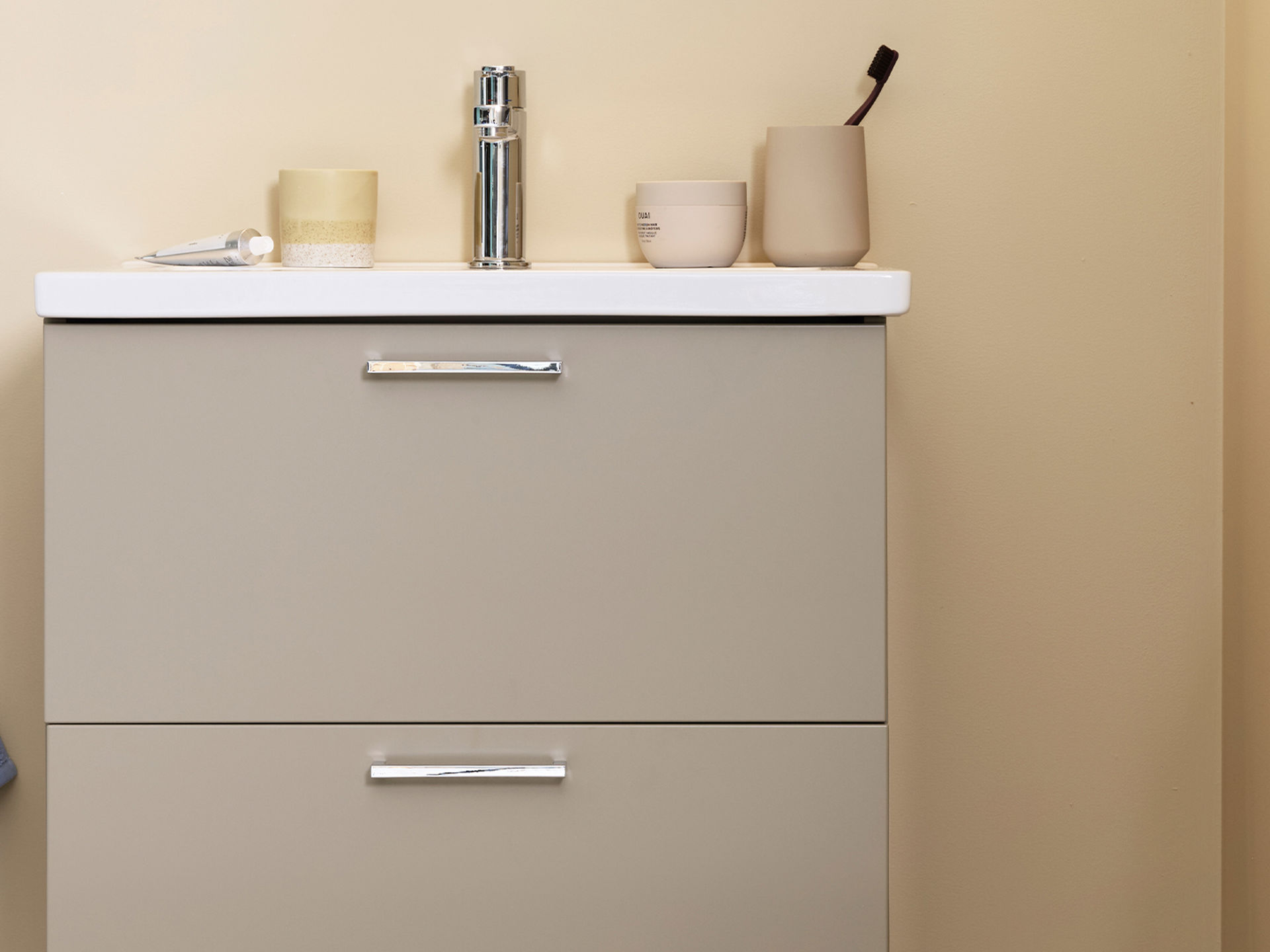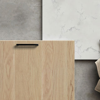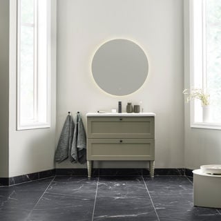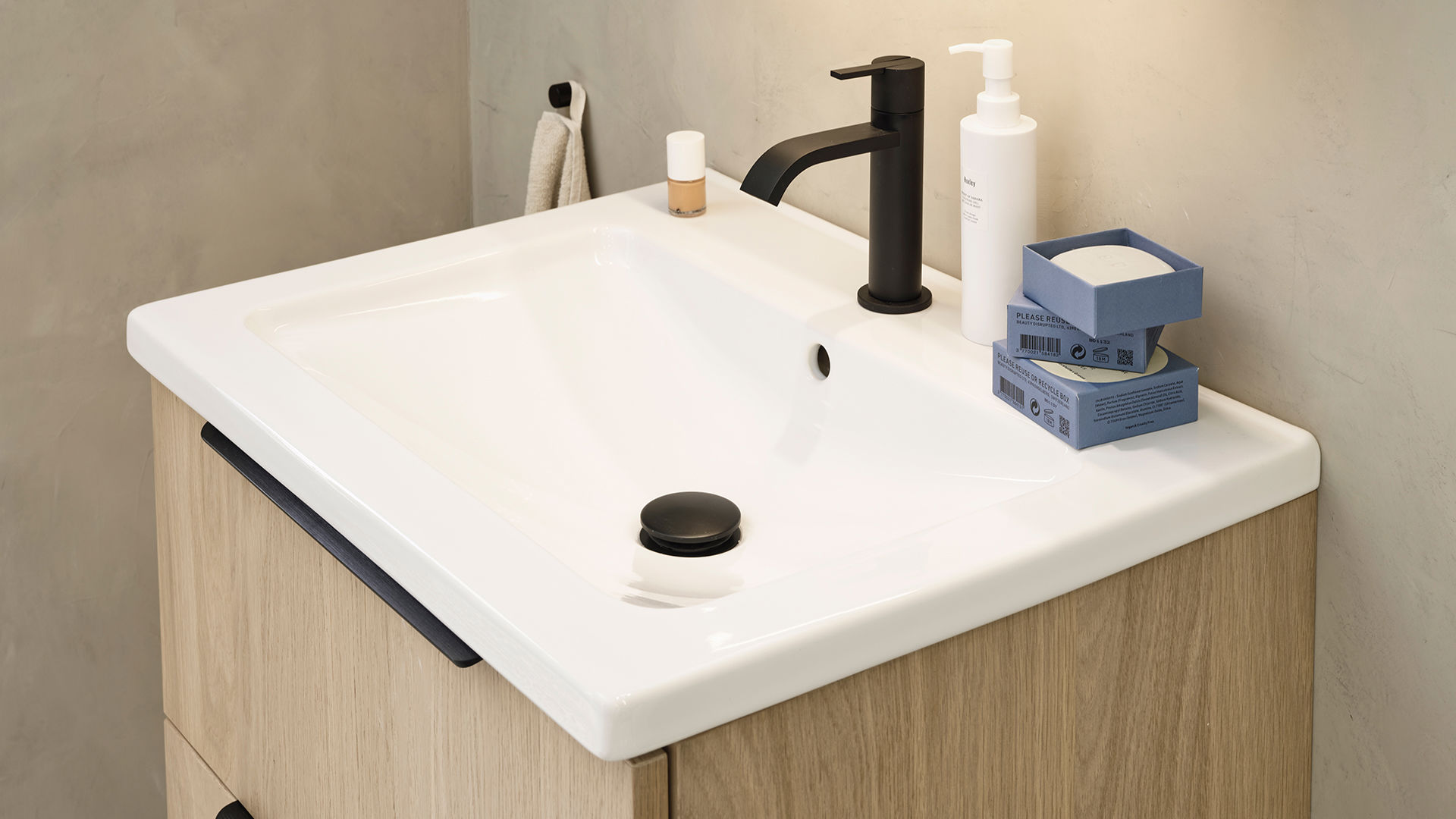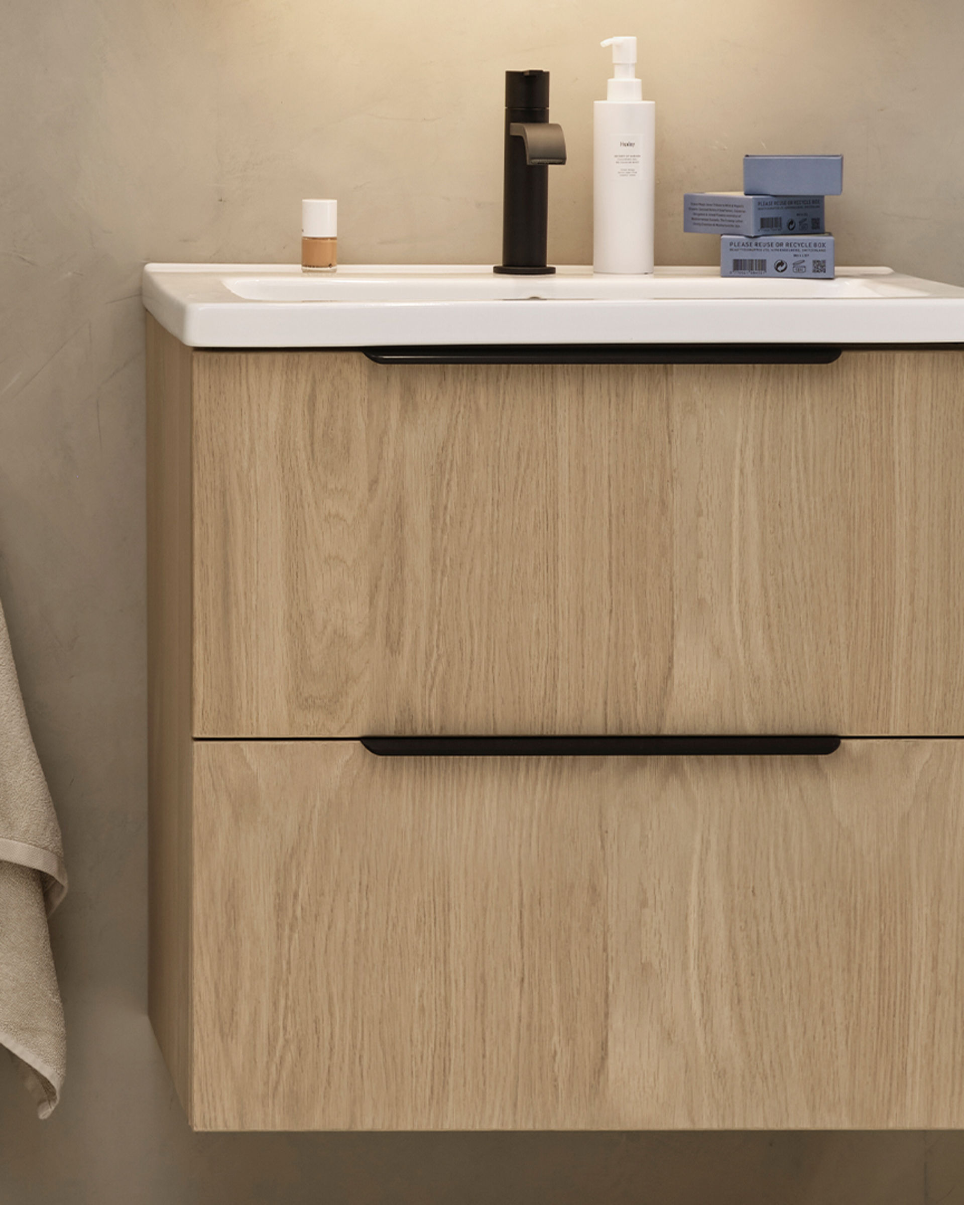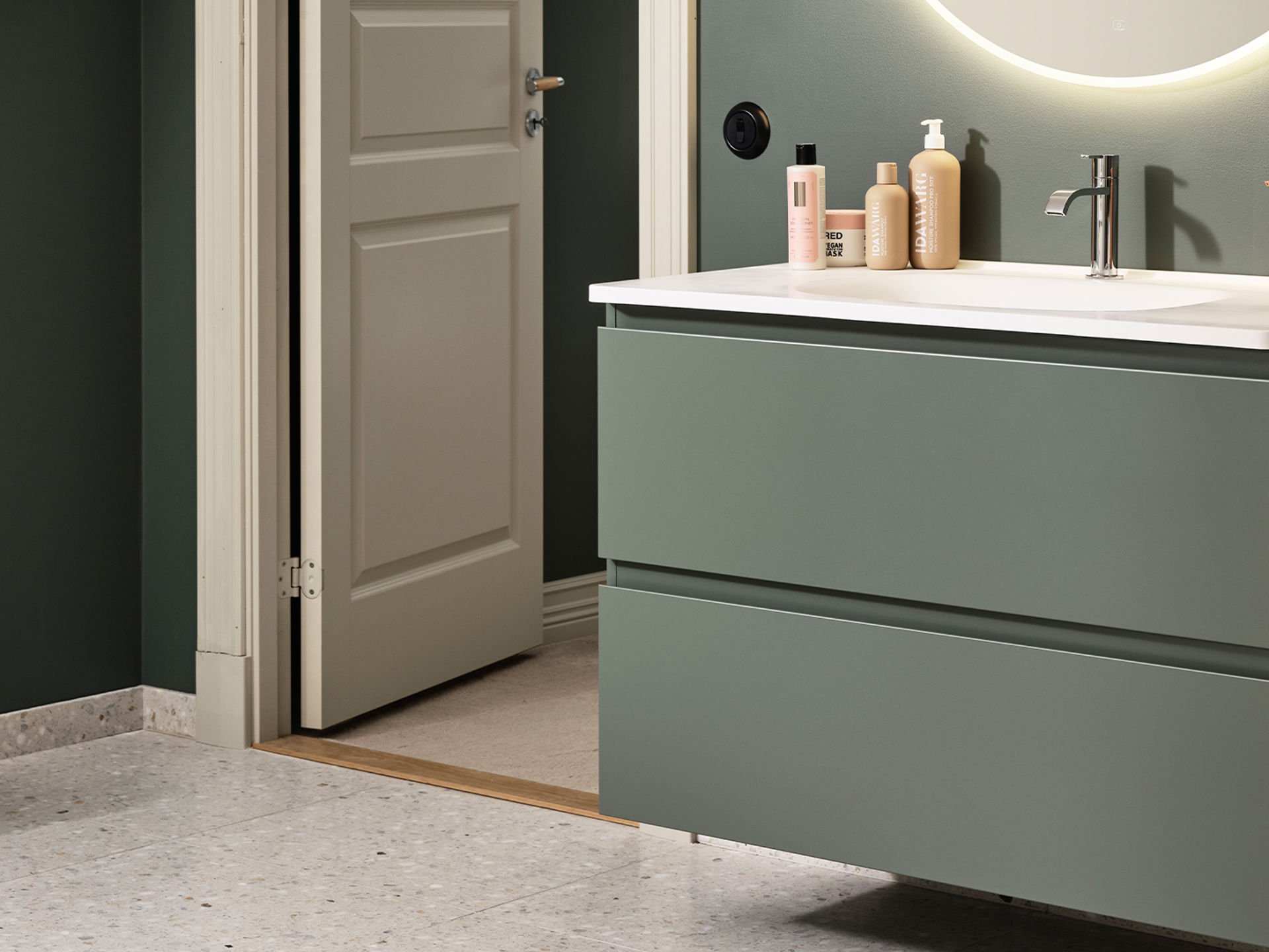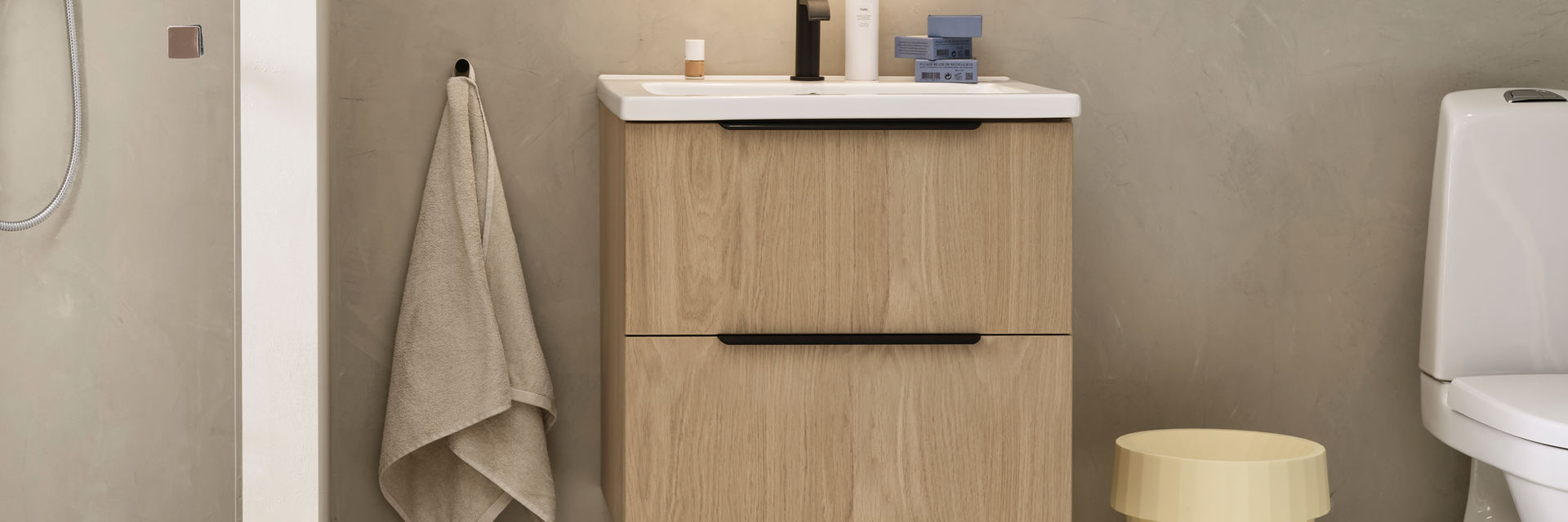 Her har vi brukt den svanemerkede døren Molly på et bad som føles moderne og tidløst på samme tid. Mikrobetong på vegger og gulv sammen med innredning i hvitpigmentert eik med ubehandlet trefølelse skaper et nedstrippet, levende og naturlig miljø.