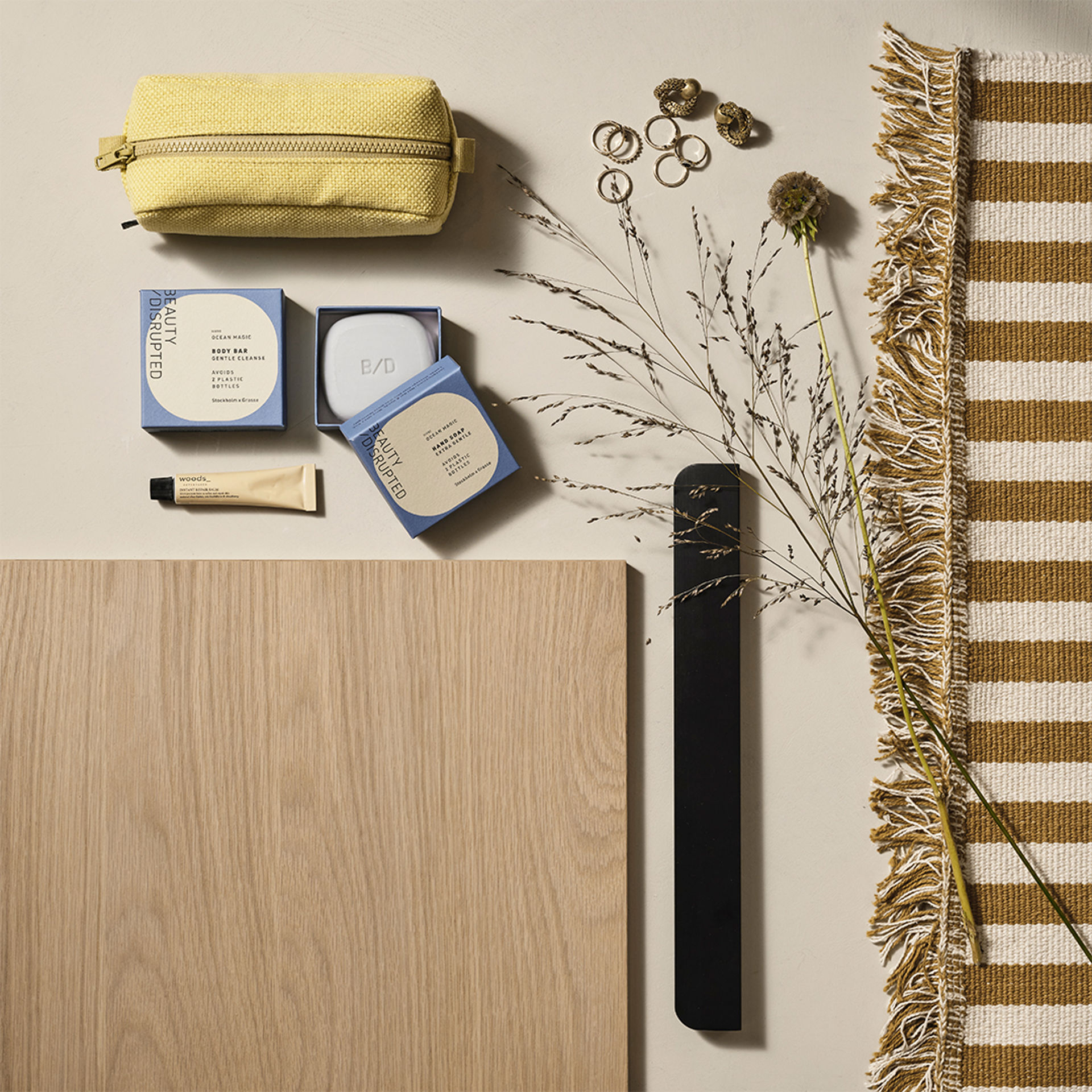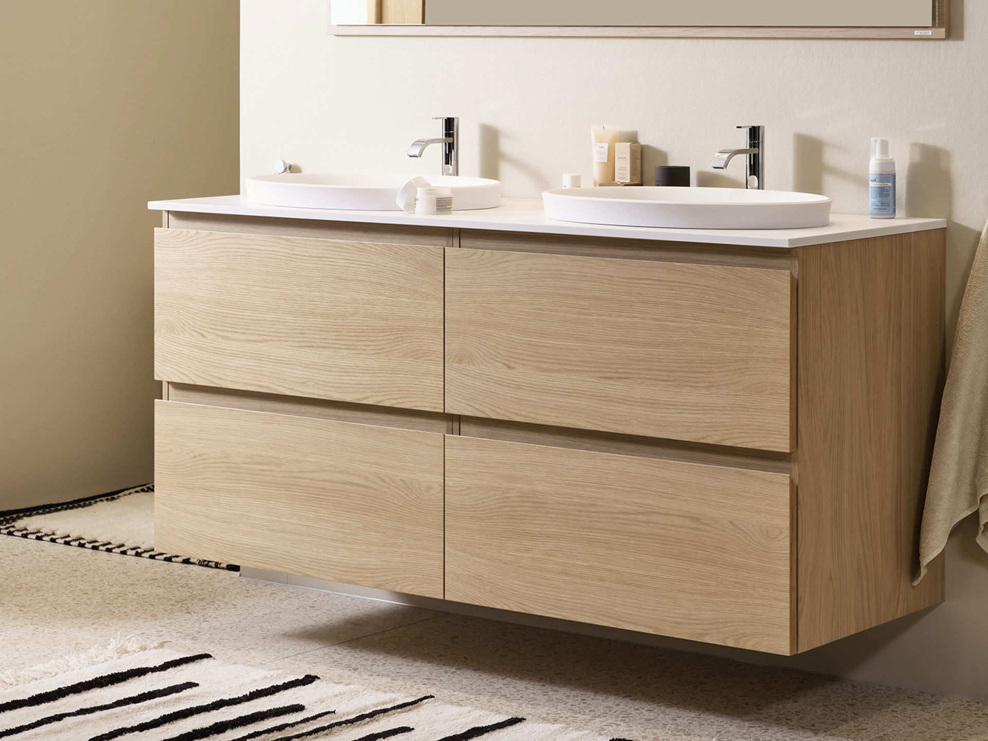 Tidløst og moderne bad mednaturlig trefølelse.