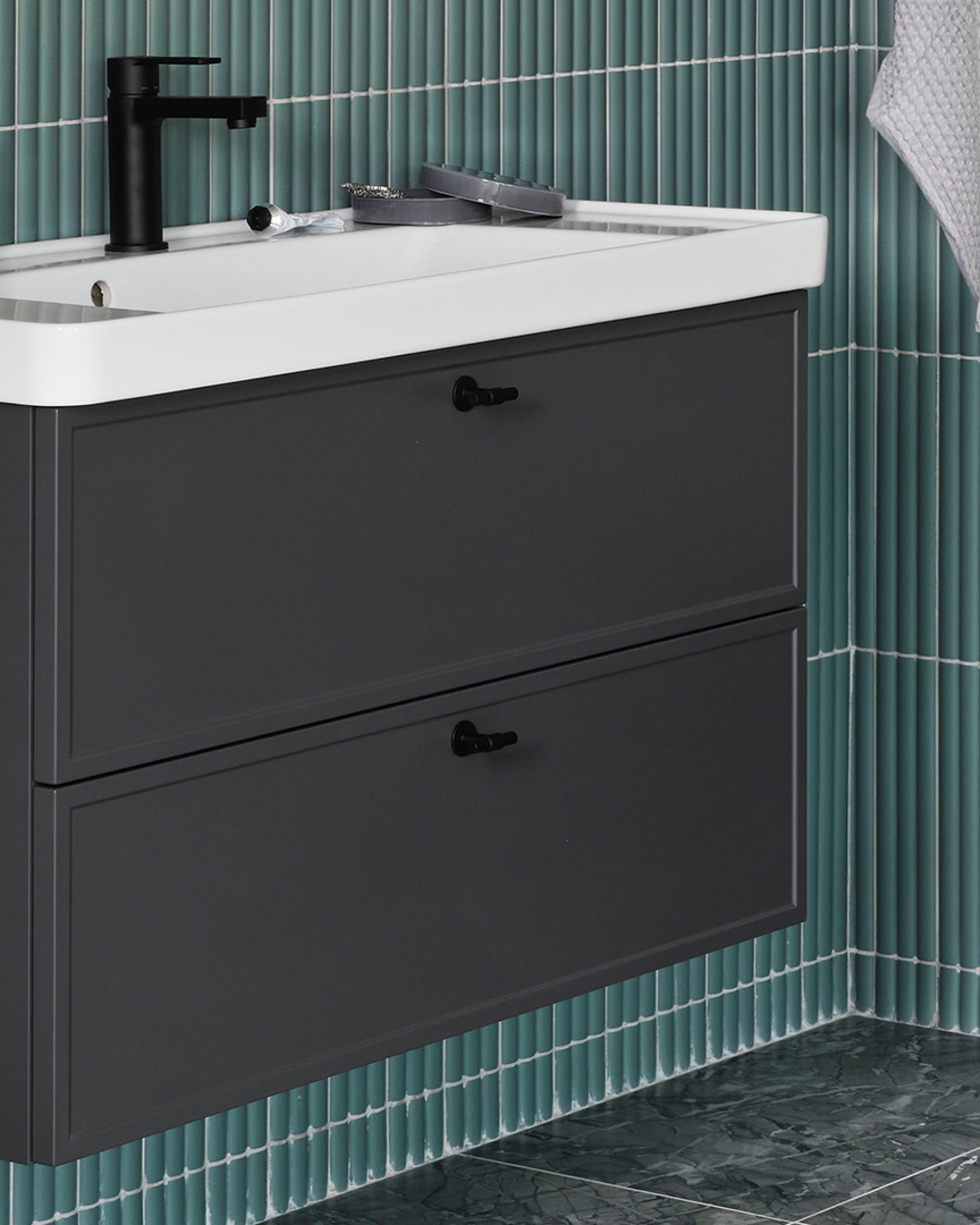 Mezzo-serien fås i breddene 500, 600, 900 og 1200 mm og med dører i alle våre standardfarger. Du kan velge enten Mezzo servant i porselen med Easy Clean-vannlås, eller den toppmonterte, avrundede servanten Soprano i Solid Surface med topplate i Solid Surface, komposittstein Moorland Fog eller Turbine Grey og vannlås som standard. Velg en uinnrammet kommode med dør Maja eller Thea, eller en innrammet kommode med dør Moa eller Edit. Avslutt med et håndtak eller en trykkfunksjon som passer din stil. Mint-skuffedeler og gummimatte er inkludert.