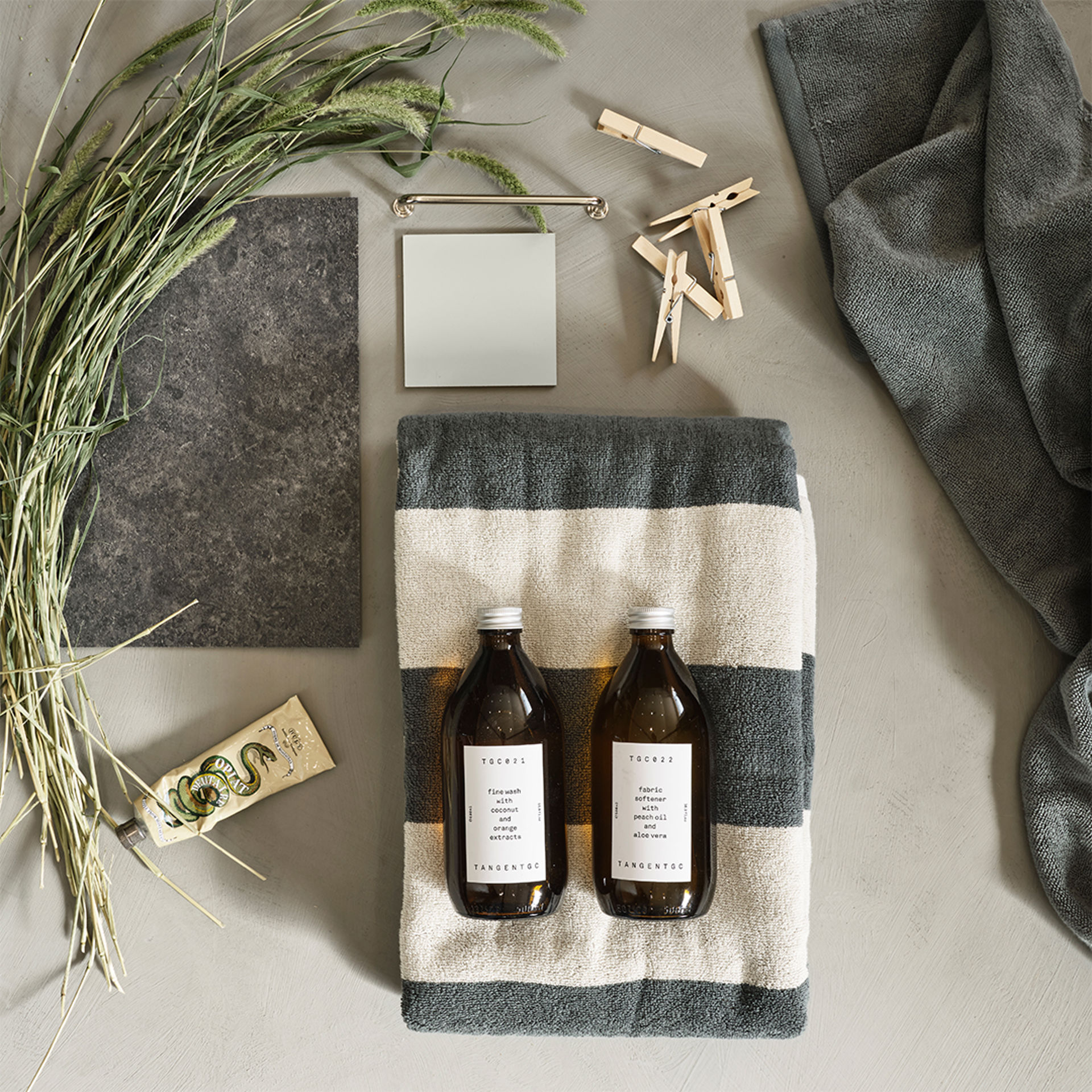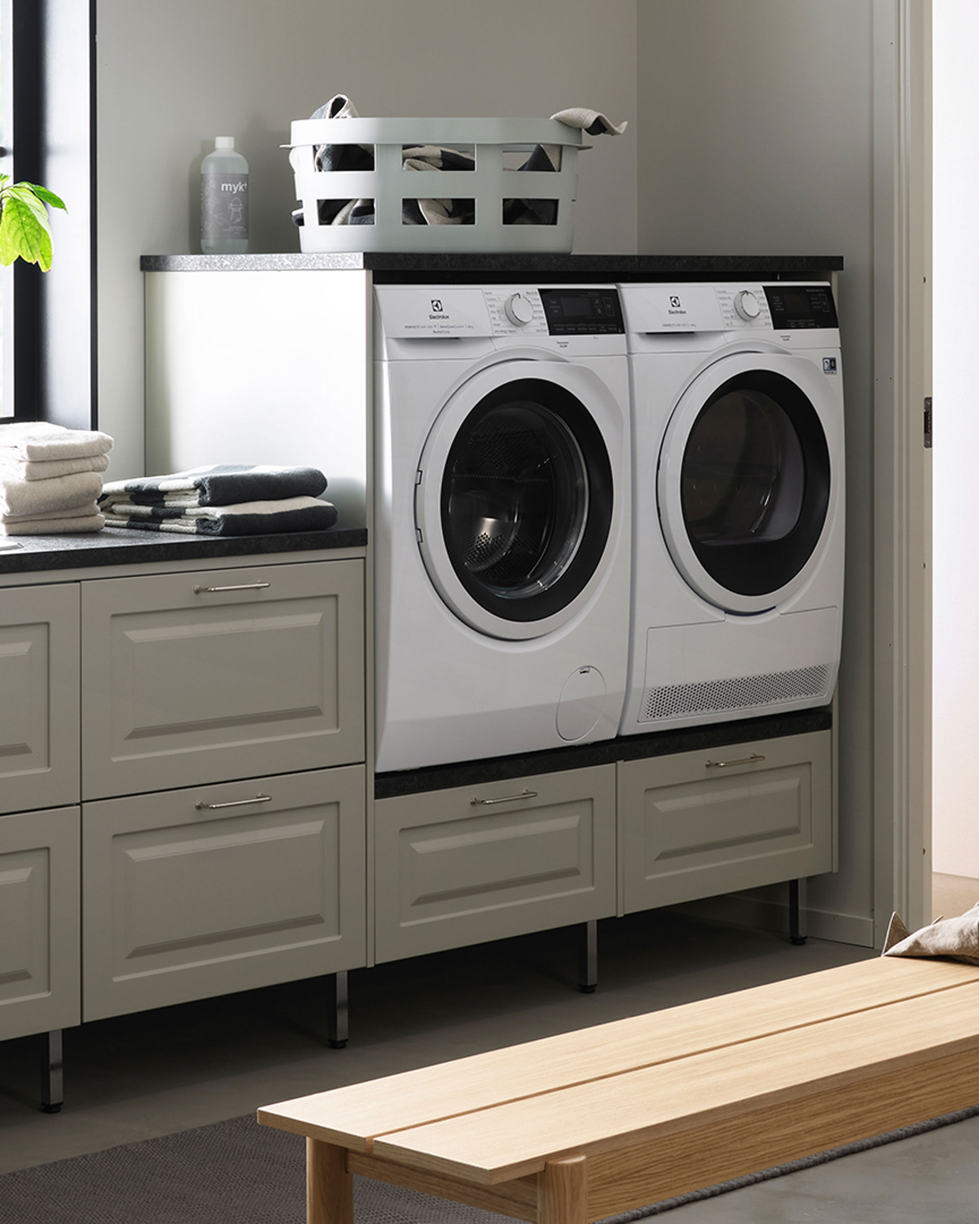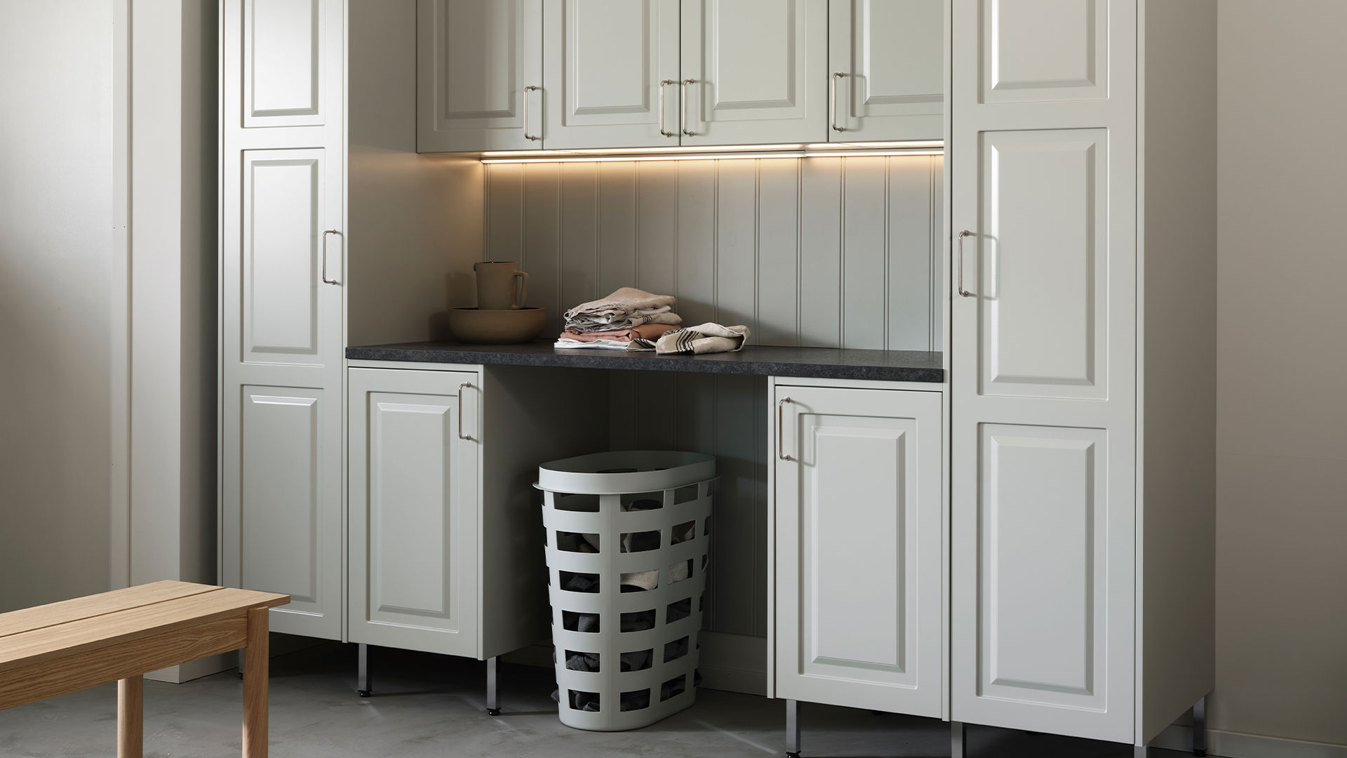 I dette vaskerommet er det trivelig å være. Med den klassiske døren Alice i varmgrått har vi skapt et koselig rom med plass til vask og annen klespleie, men vi har også valgt å integrere en skrivebordsplass. Kanskje for hjemmearbeid, en symaskin – eller du får selskap av barn som gjør lekser mens du tar hånd om klesvasken.